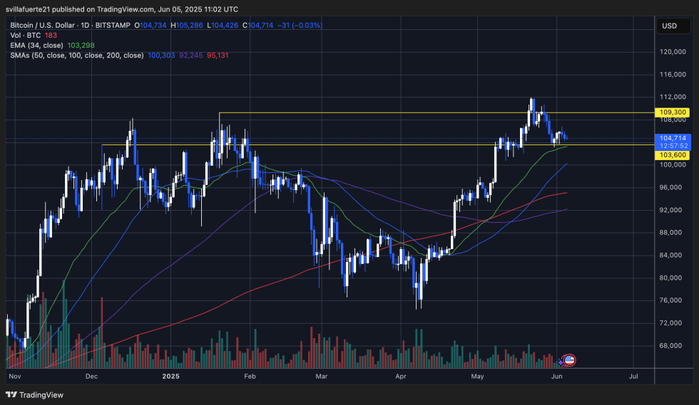 On the downside, a confirmed break below $103,600 could trigger a sharper correction, with the next key support at the 100-day SMA near $92,245. Traders should watch for a daily close outside of this range to determine the next directional move.