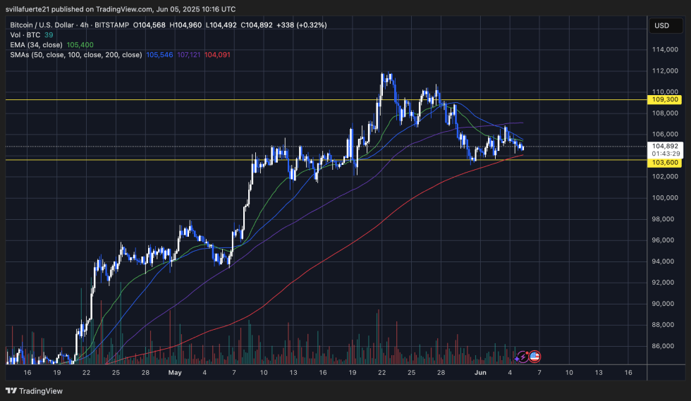 Bitcoin is currently trading around $104,892 on the 4-hour chart, caught in a tightening range between key support at $103,600 and resistance at $109,300. After failing to hold above $110K in late May, BTC has pulled back and now hovers just above the 200 SMA, which aligns closely with the $103,600 support zone, making this level a critical area to defend.