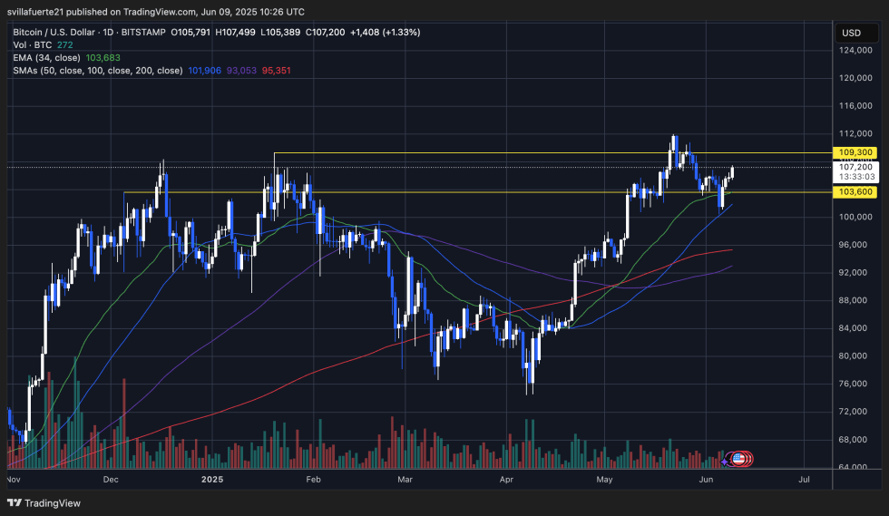Bitcoin is trading at $107,200 after gaining 1.33% on the day, continuing its rebound from the $103,600 support level. The daily chart shows BTC climbing steadily, reclaiming the 34-day EMA at $103,683 and holding well above the 50-day and 100-day SMAs, currently at $101,906 and $93,053, respectively. This clean reclaim of key moving averages is a bullish technical signal, showing that momentum is gradually shifting back in favor of the bulls.
