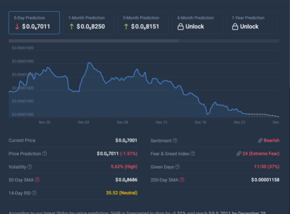 The Shiba Inu price action over the last few months has been incredibly bearish, especially as attention begins to shift away from meme coins. The current trend suggests that investors are leaning more toward selling as the altcoin’s price is now almost 92% below its 2021 all-time high. Even as the year draws to a close, the prognosis for the meme coin has not changed, with a machine learning algorithm predicting that the SHIB price will continue to fall.